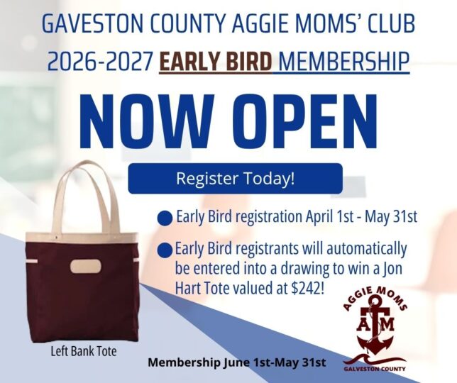 We invite you to become a member of Galveston County Aggie Moms’ Club! The Aggie Network is more than just a tradition, it’s a family. And as part of that family, you have access to a wealth of knowledge, encouragement, and friendship through our Club and beyond. Join today!